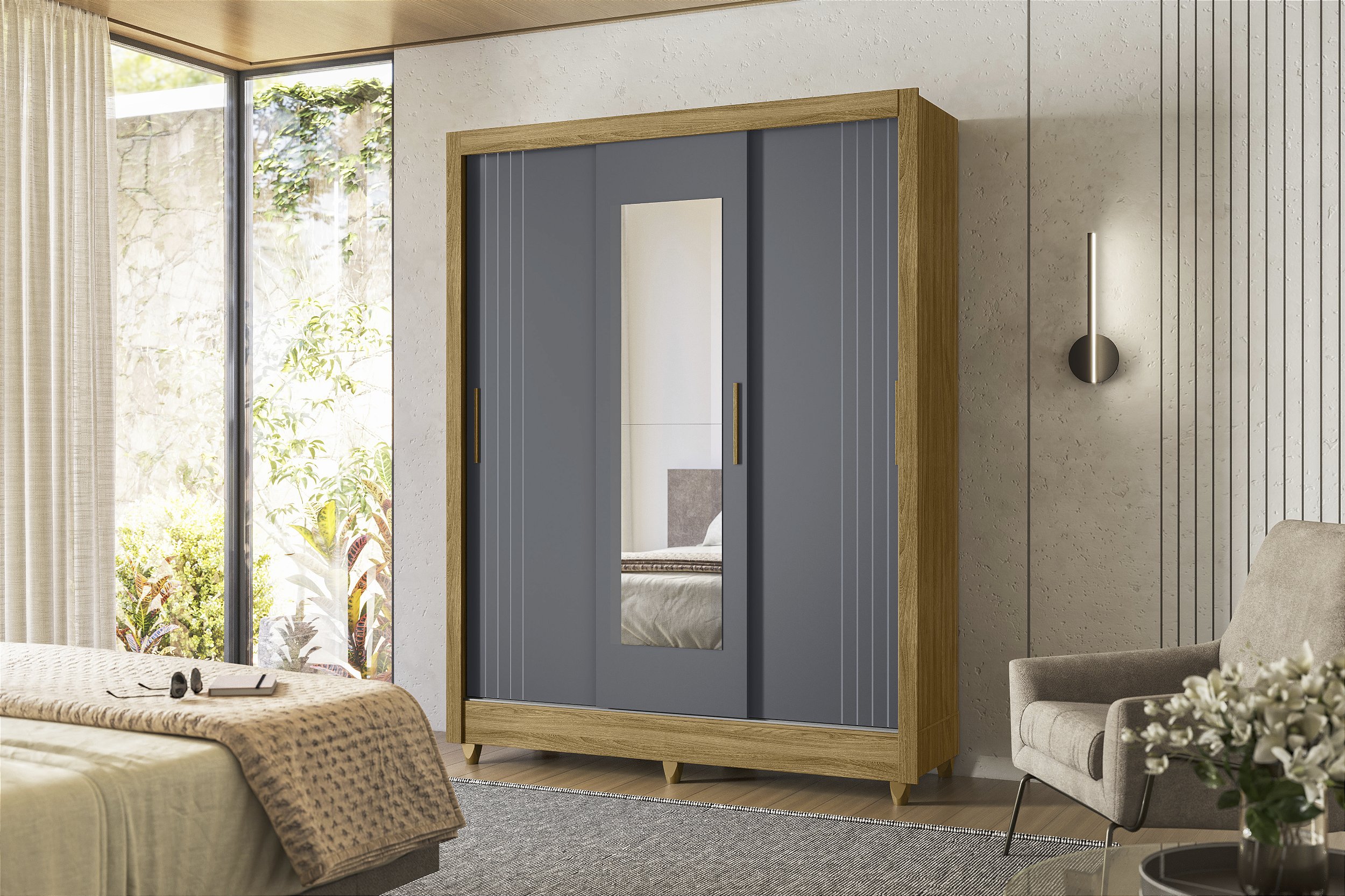 DIFERENCIAL: 3 portas de correr (sendo 1 com espelho e 2 com detalhe frisado), 2 gavetas para melhor armazenamento, amplo espaço interno, acabamento fosco, acabamento em pintura UV que dá mais durabilidade ao produto, pode ser usado com pés ou sem pés.